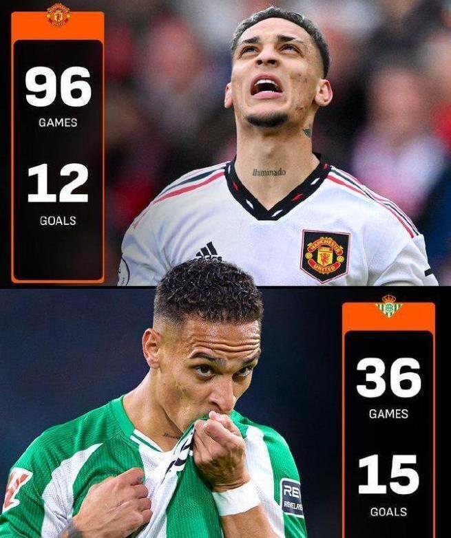 眼看著安東尼在皇家貝蒂斯大放異彩,紅魔球迷內心是五味雜陳。要知道當初曼聯引進這位巴西前鋒,可是砸下近億歐元(9500萬歐元)的轉會費,但是怎奈安東尼在紅魔的表現始終不盡如人意。到目前為止,安東尼代表皇家貝蒂斯出戰36場比賽,已經為球隊貢獻15粒進球。相反安東尼在曼聯的三個賽季,96場比賽中只有12球入賬。